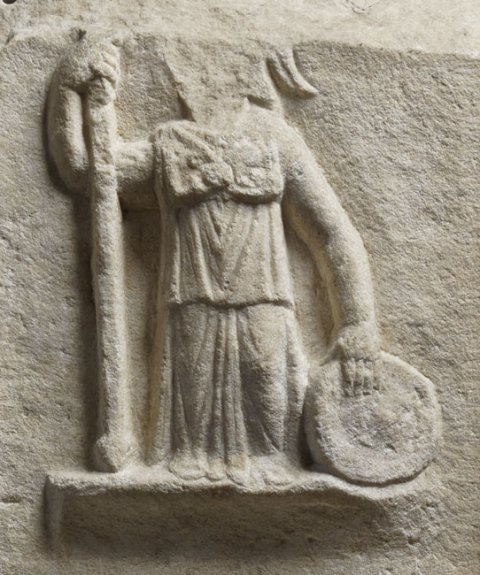- Auf den Nebenseiten mythische Figur auf flachem Podest : Links stehende Juno in gegürtetem Chiton und über den Kopf gezogenem Mantel, in der Rechten Schale, in der Linken Szepter (an der Spitze Adlerfigur ?). Rechts Minerva in Peplos mit Überschlag, Ägis, Helm, in der Rechten Lanze, in der Linken Rundschild.