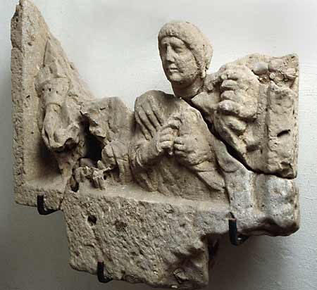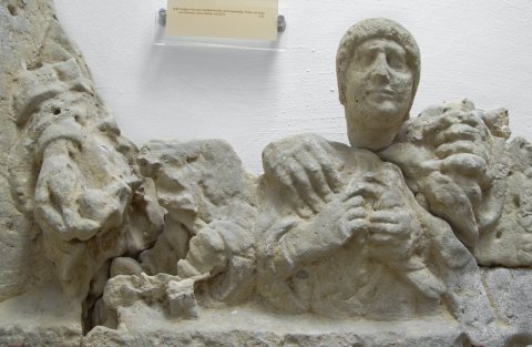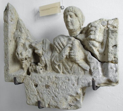 - Familie: in Nische mit unten angearbeitetem Zapfen Halbfiguren eines Ehepaares mit zwei Kindern. Links Frau: Ärmeltunica, Mantel, in der Rechten Frucht. Rechts Mann (Soldat). Waffen: in der Linken Schwert, Schwertgurt (Balteus) mit Scheibe. Vorn links Knabe: Sagum, Rolle (volumen). Rechts Mädchen: gesträhnte Frisur, Ärmeltunica, Armband, in der Linken Vogel.