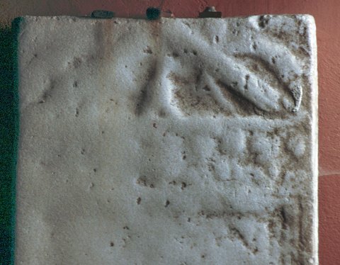 Eingeschriebener Giebel, darin Adler mit ausgebreiteten Flügeln, auf den Schrägen Delphin (?).
