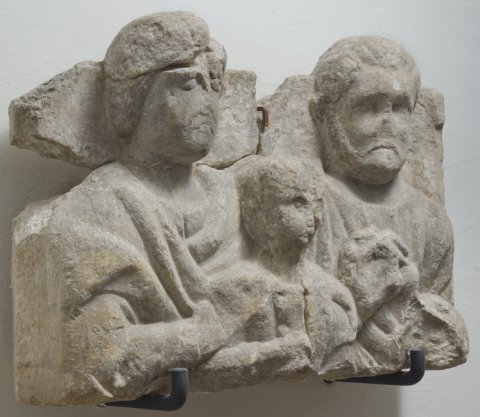 - Familie: Brustbilder eines Ehepaares mit Kind. Links Frau, rechts Mann: bärtig, Sagum, Scheibenfibel, in der Linken Rolle (volumen). Vorn Knabe im Sagum.