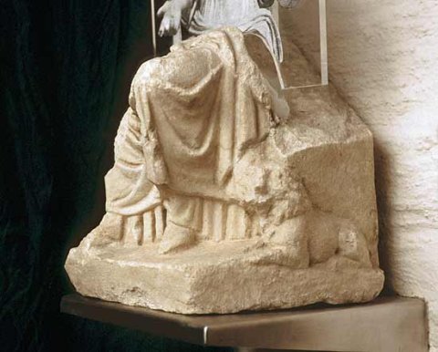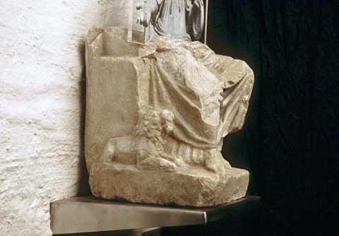 - Mythische Figur (Kybele): Göttin in Chiton u. Mantel auf einem von liegenden Löwen flankierten Thron mit glatten Seitenwänden.