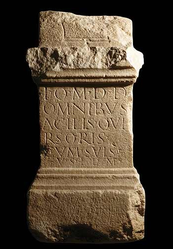 - I(ovi) O(ptimo) M(aximo) d(is) d(eabusque) / omnibus / Agilis Que/rsoris / cum suis / v(otum) s(olvit) l(ibens) l(aetus) m(erito)