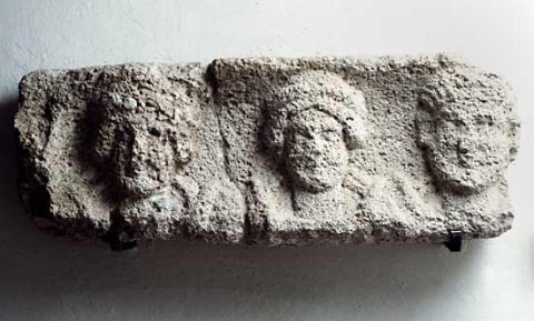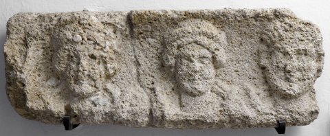 - Familie: in Rechtecknische Büsten von drei Personen. Links einheimische Frau: Haube, Fibeln. In der Mitte einheimische Frau (Tochter): Haube, Fibeln. Rechts Mann: bärtig, auf der rechten Schulter Fibel.