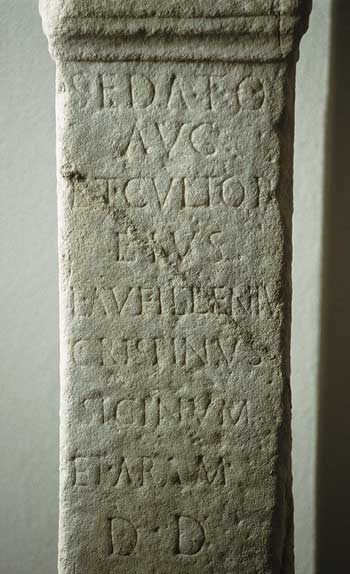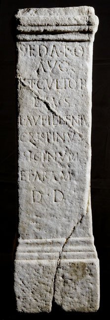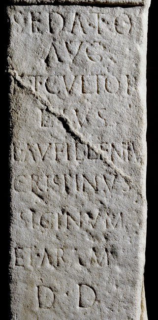 - Sedato / Aug(usto) / et cultor(ibus) / eius / L(ucius) Aufilleniu[s] / Crispinus / sig{i}num / et aram / d(onum) d(edit)