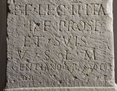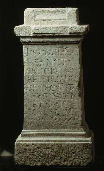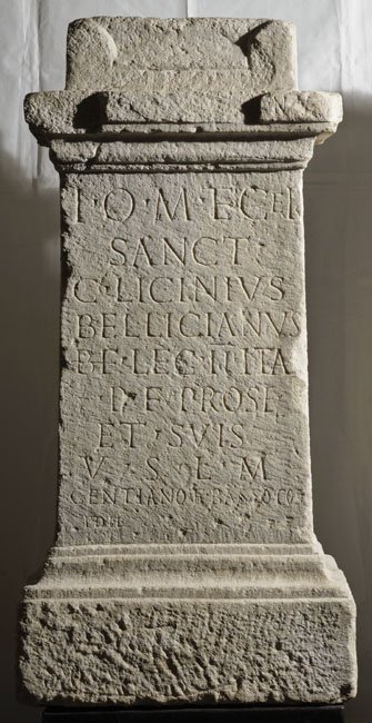 - Pro s(alute) Augg(ustorum) nn(ostrorum) / I(ovi) o(ptimo) m(aximo) et Cel(eiae) / sanct(ae) / C(aius) Licinius / Bellicianus / b(ene)f(iciarius) leg(ionis) II Ital(icae) / p(iae) f(idelis) pro se / et suis / v(otum) s(olvit) l(ibens) m(erito) / Gentiano et Basso co(n)s(ulibus) / Idib(us) [Dec(embribus) ]