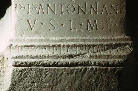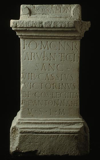 - Pro sal(ute) d(omini) n(ostri) / Imp(eratoris) Antonini Pi(i) F(elicis) A[ug(usti)] / I(ovi) O(ptimo) M(aximo) Conse(rvatori) / Arubiano et Cel(eiae) / sanc(tae) / Vib(ius) Cassius / Victorinus / b(ene)f(iciarius) co(n)s(ularis) leg(ionis) II Ita(licae) / P(iae) F(idelis) Antoninian(a)e / v(otum) s(olvit) l(ibens) m(erito) / L(a)eto II et Ceriale co(n)s(ulibus)