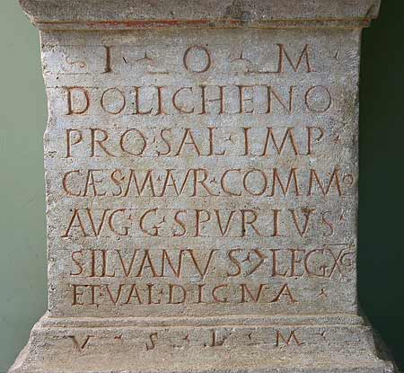 - I(ovi) o(ptinmo) m(aximo) / Dolicheno / pro sal(ute) Imp(eratoris) / Cases(aris) M(arci) Aur(elii) Commo(di) / Aug(usti) C(aius) Spurius / Silvanus (centurio) leg(ionis) X g(eminae) / et Val(eria) Digna / v(otum) s(olverunt) l(ibentes) m(erito)