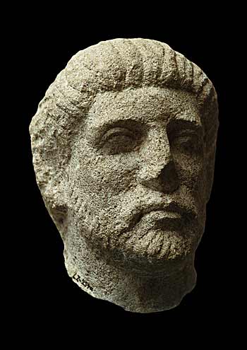 - Porträtkopf eines älteren Mannes, bärtig, in die Stirn gekämmtes gesträhntes Haar. Teil eines Grabreliefs.