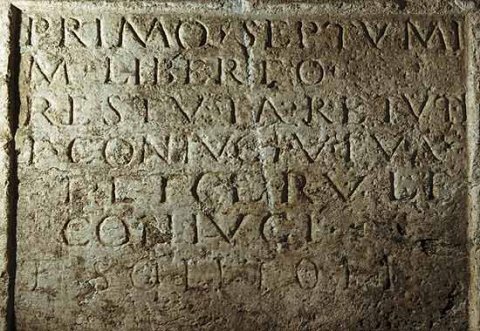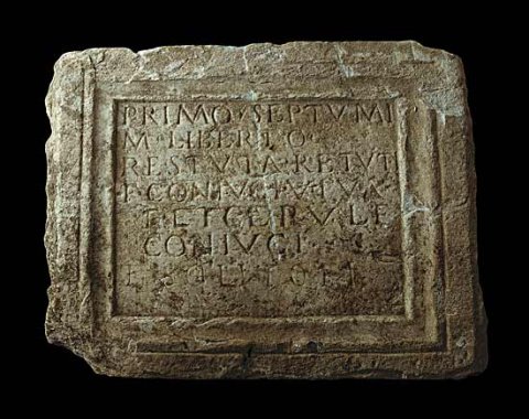 - Primo Septumi / M(arci) liberto / Rest(it)uta Re(s)t(it)uti / f(ilia) coniugi viva / f(ecit) et Cervul(a)e / coniugi / et Solito fi(lio)