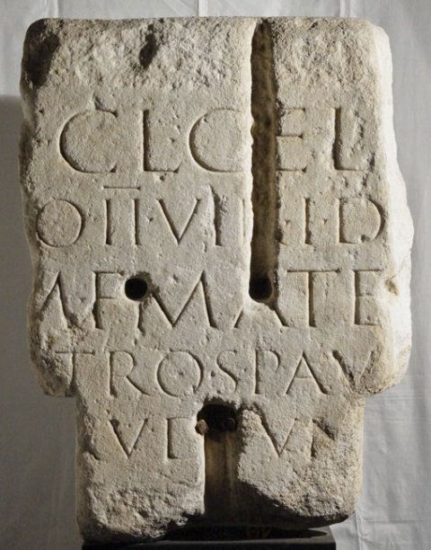 - [ --- ] f(ili-) Cl(audia) Cel[eia] / [ ---]o IIvir(-) i(ure) d(icundo) / [--- ] M(arci) f(ilio) Mate[r]no / [ --- ] Tros(i-) Paul(---) et / [ --- Cl]aud(iae) [E]unae [ --- ]