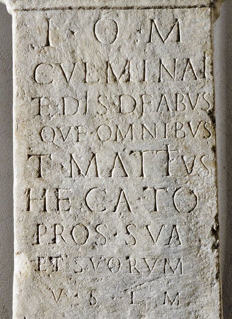 - I(ovi) o(ptimo) m(aximo) / Culminali / et dis deabus/que omnibus / T(itus) Mattius / Hecato / pro s(alute) sua / et suorum / v(otum) s(olvit) l(ibens) m(erito)