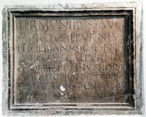 - Termunibus(!) Au<g=C>(ustis) / sacr(um) Q(uintus) Calpurnius / Phoebianus c(onductor) f(errariarum) N(oricarum) et / Quintus Calpurnius / Phoebianus iunior et / Charitonianus fili(i) / restituerunt curante / C(aio) Iul(io) Hermete proc(uratore)
