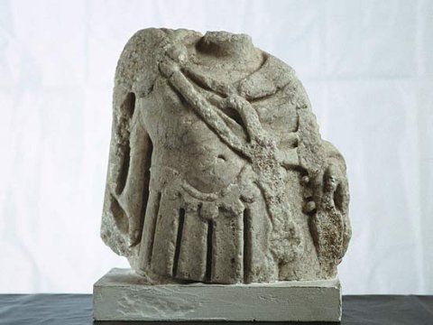 - Mythische Figur (Jupiter Dolichenus): stehender Gott in Panzer mit Pteryges und Mantel mit Scheibenfibel, Schwertgurt (Balteus), Schwert mit Adlerkopfgriff, Schwertscheide mit Dosenortband, in der Linken Blitzbündel.