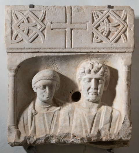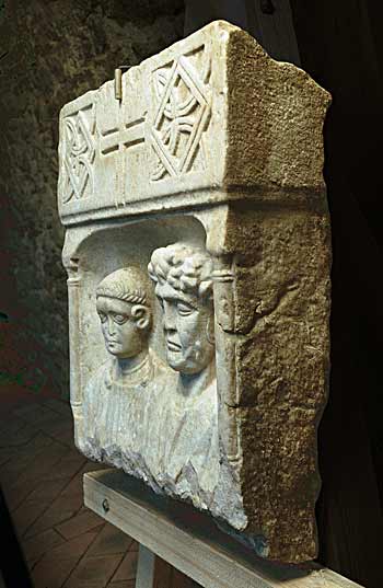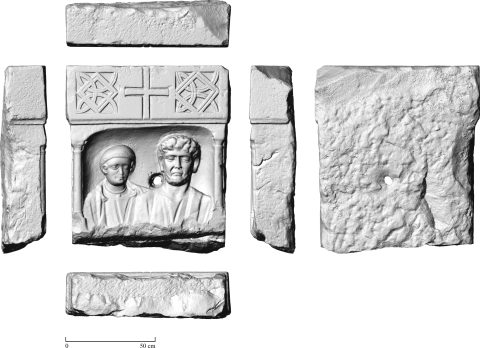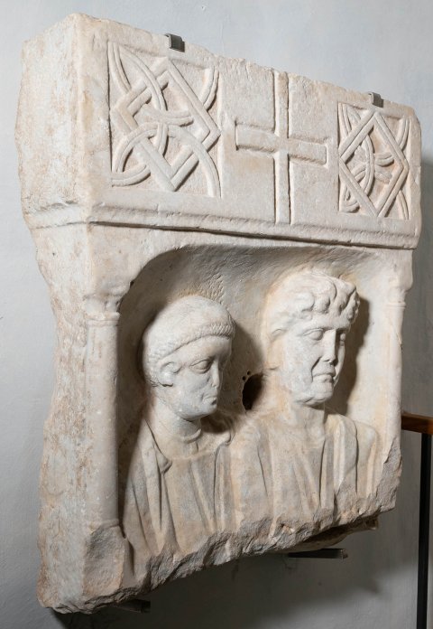 - Flache Bogennische auf Säulen, darin zwei Brustbilder (Ehepaar). Links einheimische Frau : Haube, Umhang, Fibeln, Halsreif. Rechts Mann: bärtig, Locken, Sagum (?). Gesichter im Mittelalter verändert, Ornament (Kreuz zwischen Flechtwerk) über der Bogennische 12. Jh.