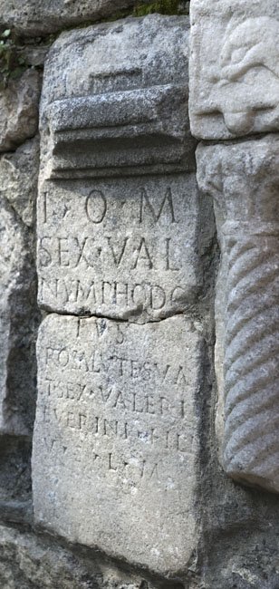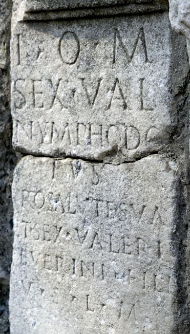 - I(ovi) o(ptimo) m(aximo) / Sex(tus) Val(erius) / Nymphodo/tus pro salute sua / et Sex(ti) Valeri(I) / Severini fili / v(otum) s(olvit) l(ibens) m(erito)