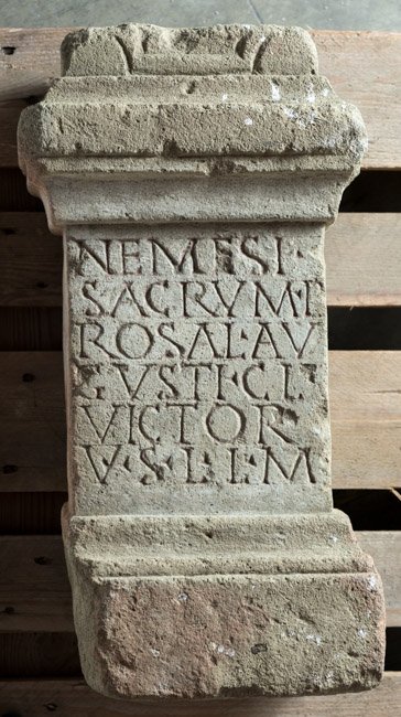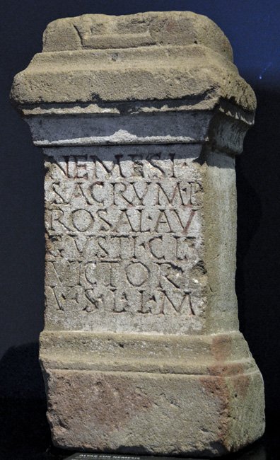 - Nemesi / sacrum p/ro sal(ute) Au/gusti Cl(audius) / Victor / v(otum) s(olvit) l(ibens l(aetus) m(erito)