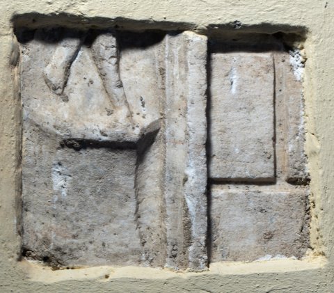 - Rechts Rest von Quaderimitation, links Rahmenfeld mit tanzender Figur (Satyr ?) auf hohem Podest (nur Füße erh.).