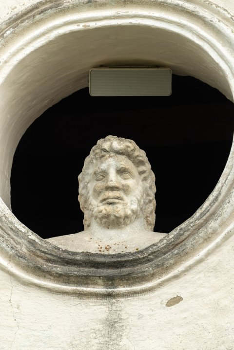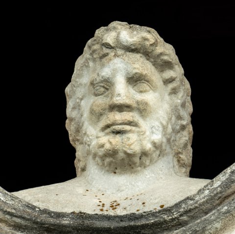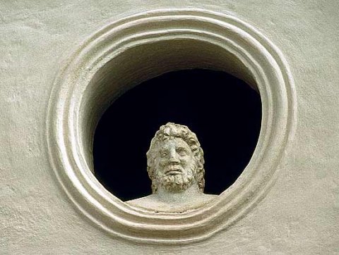 - Mythische Figur: Jupiterkopf mit langem gelockten Haar u. Bart, Schultern unbekleidet.
