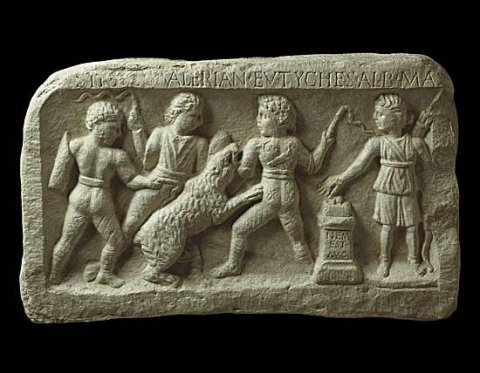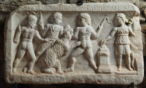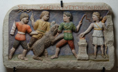 - Mythische Figur : Rechts an einem Altar steht auf flacher Basis Nemesis mit Diadem, kurzem Chiton mit Gürtel u. Überschlag, Schuhen, Köcher u. Bogen, die Rechte hält eine Weihrauchkugel über den Altar. Drei Gladiatoren (venatores, bestiarii) in Hosen, die mit Riemen kreuzweise umwickelt sind, Wickelgamaschen u. kurzen gegürteten Tuniken kämpfen mit Peitschen gegen einen Bären.
