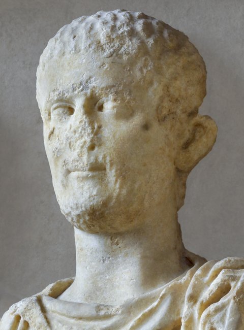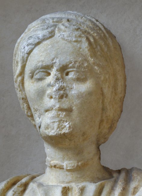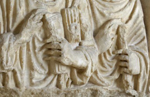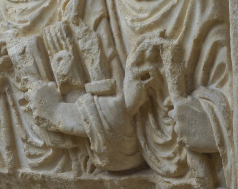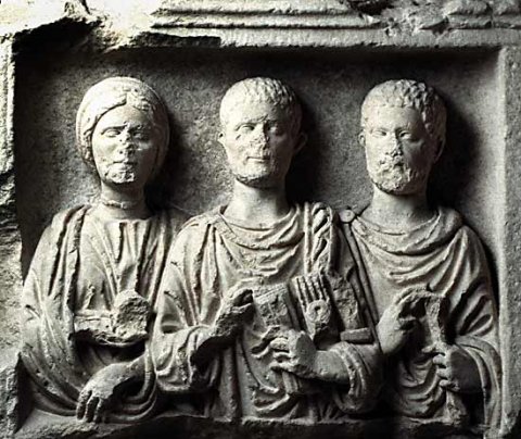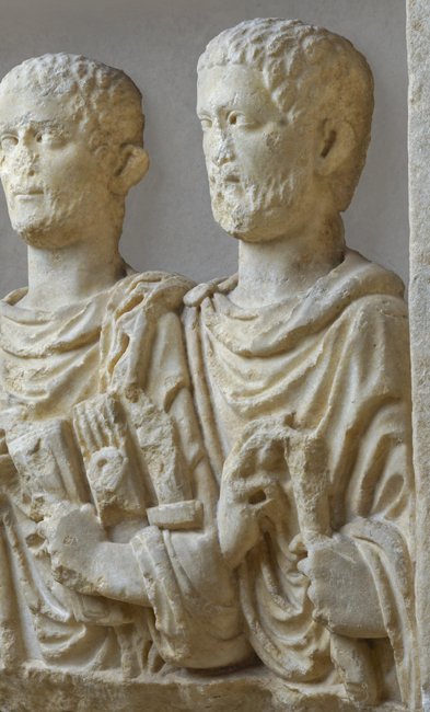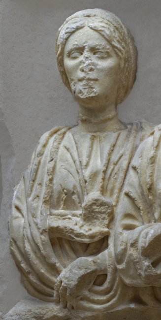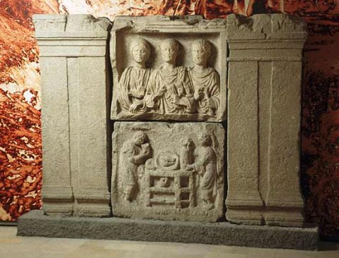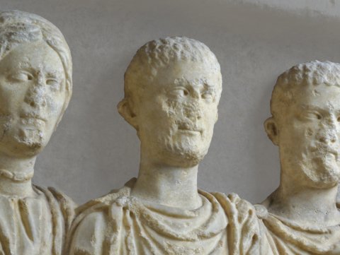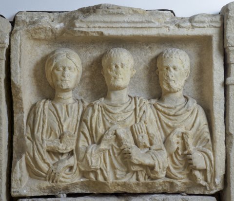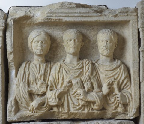 - In Rechtecknische mit oben profiliertem Rahmen drei Halbfiguren einer Familie. Links Frau: Mittelscheitel, Haarnetz, Tunica, Mantel, Halskette, in der Rechten Frucht. In der Mitte Mann (Soldat): bärtig, kurze Locken, Ärmeltunica, Sagum mit Fransen, Scheibenfibel, in der Linken Rolle (volumen). Waffen: im linken Arm Schwert, Etui mit Schreibzeug (Rohrfedern und Tintenfaß). Rechts Mann: bärtig, kurze Locken, Ärmeltunica, Sagum, Rosettenfibel, in der Linken Rolle.
