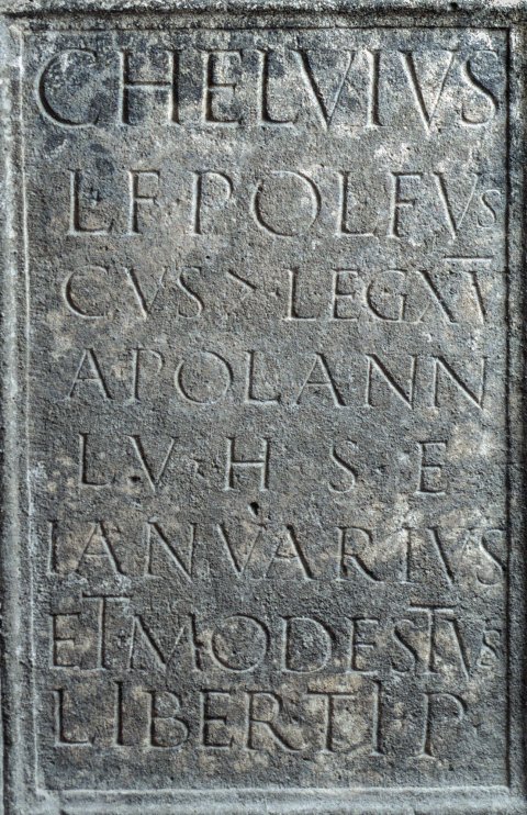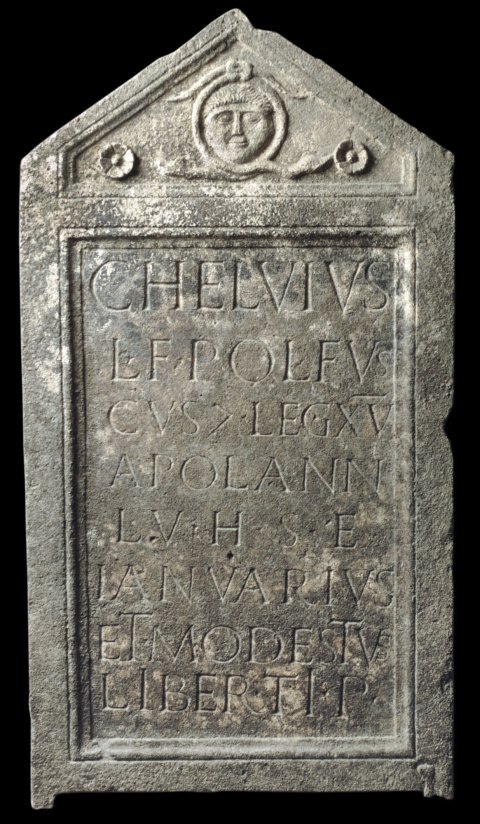 - C(aius) Helvius / L(uci) f(ilius) Pol(lia) Fus/cus |(centurio) leg(ionis) XV / Apol(linaris) ann(orum) / LV h(ic) s(itus) e(st) / Ianuarius / et Modestus / liberti p(osuerunt)