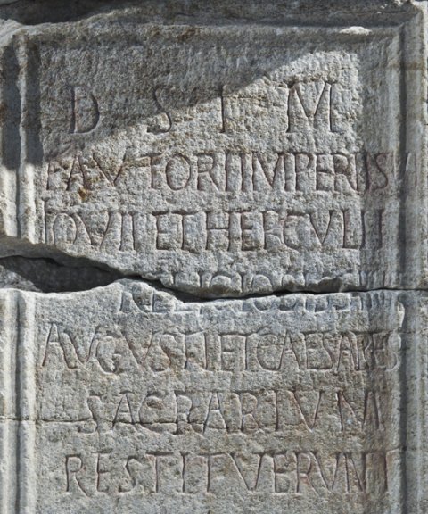 - D(eo) S(oli) I(nvicto) M(ithrae) / fautori imperii sui / Iovii et Herculii / religiosissimi / Augusti et Caesares / sacrarium / restituerunt