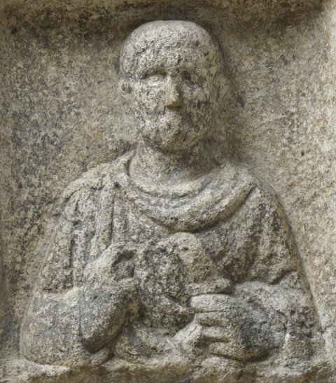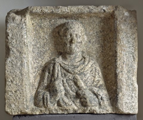 - In Rechtecknische Halbfigur eines Mannes (Soldat - Offizier): bärtig, Ärmeltunica, Sagum, Scheibenfibel. Waffen: in der Linken Schwert mit Adlerkopfgriff.