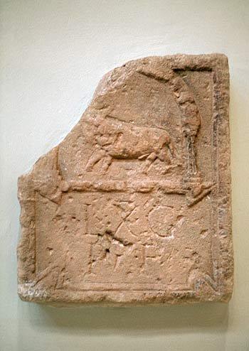- Im Bildfeld über der Inschrift Stier unter Säulenarkade.