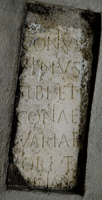 - [D(is) M(anibus)] / [sac]r(um) / [---]conius / [---]vinus / [fecit?] sibi et / [---]coniae / [---] Variae / [--- u]xori et / [---]viniano / [---