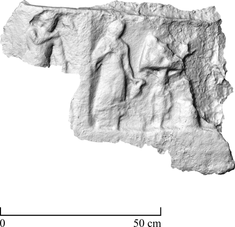 - Mittelfeld zwischen Seitenfeldern. Totenopfer: viereckiger Tisch, flankiert von großen Gefäßen, links Dienerin. Im linken Seitenfeld auf gesenkte Fackel gelehnter Trauergenius.