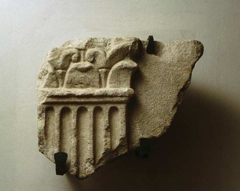 - Teil der rechten Seitenwange einer Aedicula: kannelierter Pilaster mit Blattkapitell, rechts anschließend glatte Wand.