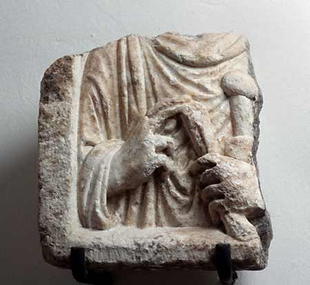 - In Rechtecknische links Brustbild eines Mannes (Soldat): Ärmeltunica, Sagum, in der Linken Rolle (volumen). Waffen: unter dem linken Arm Schwert. Rechts weitere Personen ?