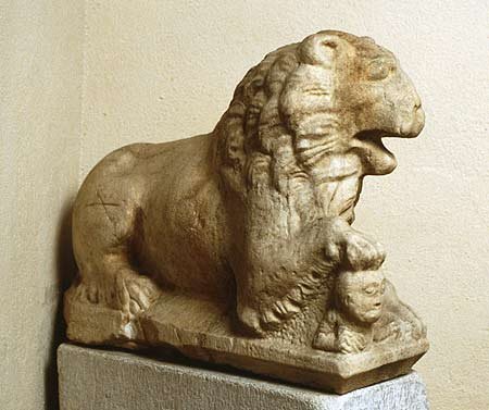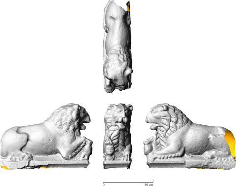 - Auf flacher Basisplatte liegende Löwen, ursprüngl. mit Tierköpfen in den Pranken.