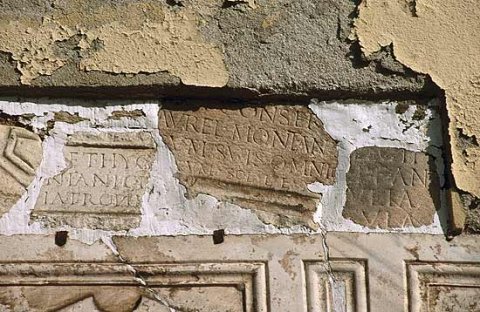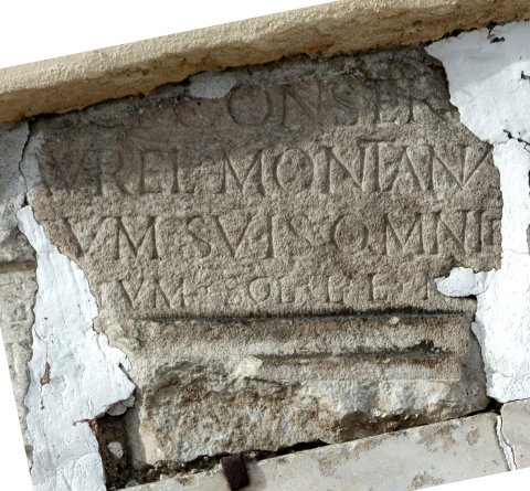 - [Genio / [l]oci conser[v(atori) / A]urel(ius) Montanus / cum suis omnib(us) / votum sol(vit) l(aetus) l(ibens) m(erito)