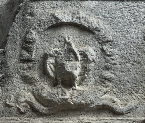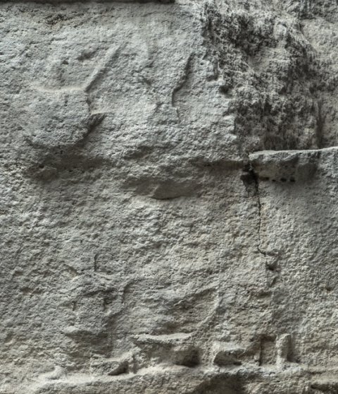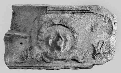 - Auf der Vorderseite Adler in Kranz mit Tänien, rechts Krug, links Halbpalmette. Auf der linken Nebenseite Tropaion mit knieenden Barbaren. Links davon Pfahl mit vexillum und gekreuzten Speeren ? Beide Reliefs sind gerahmt. Vom Relief der linken Seite ist nichts erhalten. Basis einer Reiterstatue eines Kaisers ?