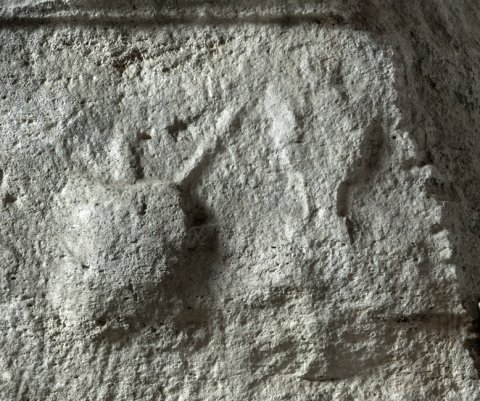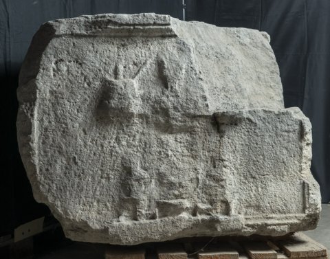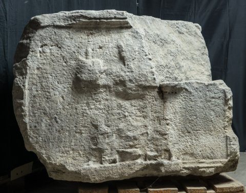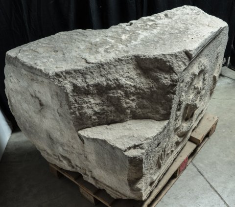 - Reliefs abgeschlagen, rechte Seite fast völlig abgebr., Rückseite abgebr., in der Oberseite Hebeloch. Sockel u. Bekrönung fehlen.