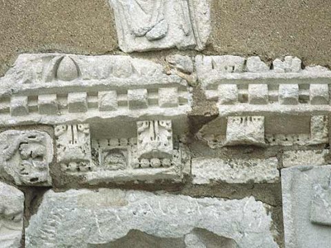 - Aedicula-Dachzone (?): Konsolgesims mit Eierstab, Zahnschnitt, Perlstab. Auf den Konsolen Akanthusblätter.