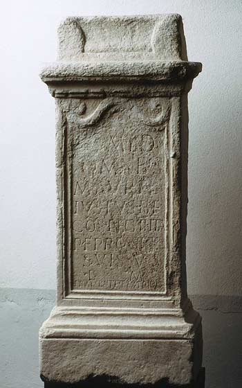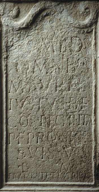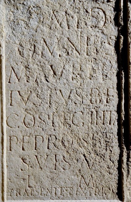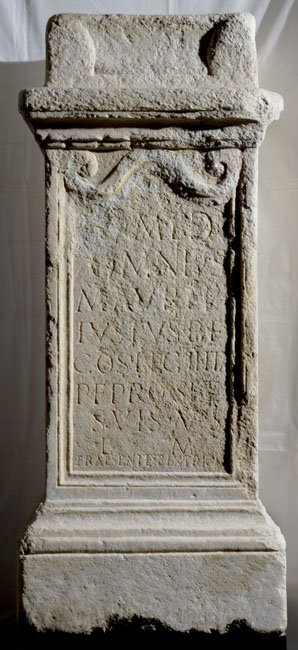 - I(ovi) o(ptimo) m(aximo) et d(is) d(eabusque) / omnibus / M(arcus) Aurel(ius) / Iustus b(ene)f(iciarius) / co(n)s(ularis) leg(ionis) II Ital(icae) / p(iae) f(idelis) pro se et / suis v(otum) s(olvit) / l(ibens) m(erito) / Praesente et Extric(ato) / co(n)s(ulibus)