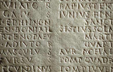 Ant(onius) Secundinus / Cornel(ius) Silvanus / Bab(b)ius Tertius / Iunius Finitus / Sanctus / Sestius Solim(a)rus / Martialis / Quartus / Aur(elius) Achaicus / Pomp(onius) Quadratus / Pomp(onius) Iuvenis / Cass(ius) Eutropus / Octavius Ursus / Var(ius) Daphinus / Quinc(tius) Niger / [ ---]R Restutus / [ --- ] Quinctili / [ ---]omin(i) / [ ---]alis / [ --- //