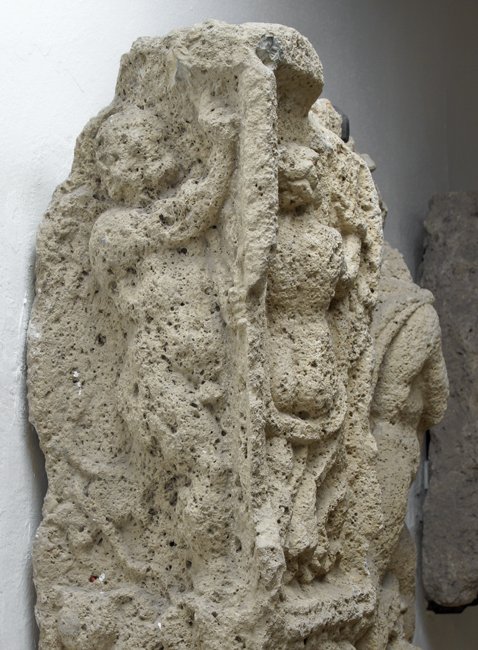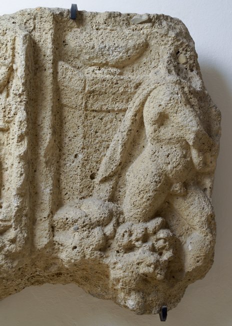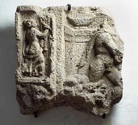 Eckblock. Mythos, mythische Figur : im Hauptbild eine der Heraklestaten (Kerberos-Cerberus ?, Augias-Stall ?). im linken Seitenfeld tanzende Mänade in Rückenansicht, darunter Feld mit Ornament.