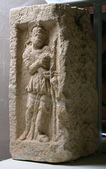 - Block einer Grabeinfassung, Eckblock links hinten. Mythische Figur : Mars mit Waffen (Helm, Panzer, Mantel, in der Linken Lanze).