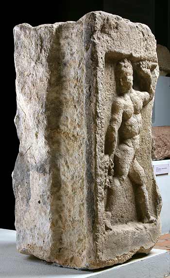 - Eckblockeiner Grabeinfassung. Auf Vorderseite und rechter Nebenseite je eine mythische Figur: auf der Vorderseite laufender nackter Satyr, in der Rechten Kranz, in der erhobenen Linken Pedum (?), auf der Nebenseite nackter Satyr, der aus einem Rhyton trinkt.