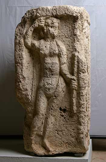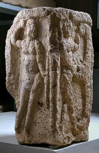Eckblock einer Grabeinfassung. Auf der Vorderseite Genius: nackter Knabe hält mit beiden Händen Peltenschild (Seitenfeld eines Inschriftfeldes ?).