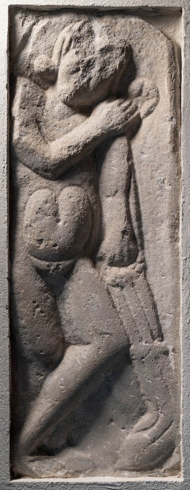 - In Bogenfeld nackter geflügelter Trauergenius, auf Fackel gelehnt, in der Linken Kranz.
