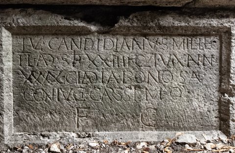 - D(is) M(anibus) // Iul(ius) Candidianus mil(es) leg(ionis) / II ad(iutricis) stip(endiorum) XXIIII qui vix(it) ann(os) / XXXX Cla(u)dia Bonosa / coniugi carissimo / f(aciendum) c(uravit)