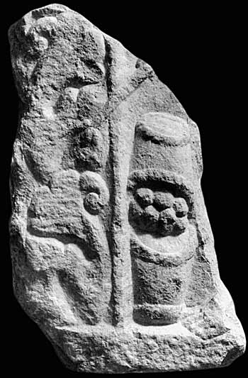- Mythische Figur (Mänade ?): links Rahmenfeld mit Blattornament, im Bildfeld links zwei Fruchtkörbe, der obere umgestülpt, darüber noch Stab einer Mänade.