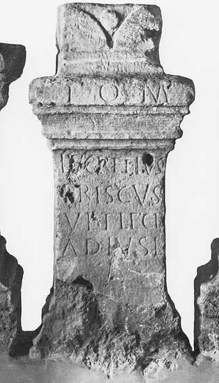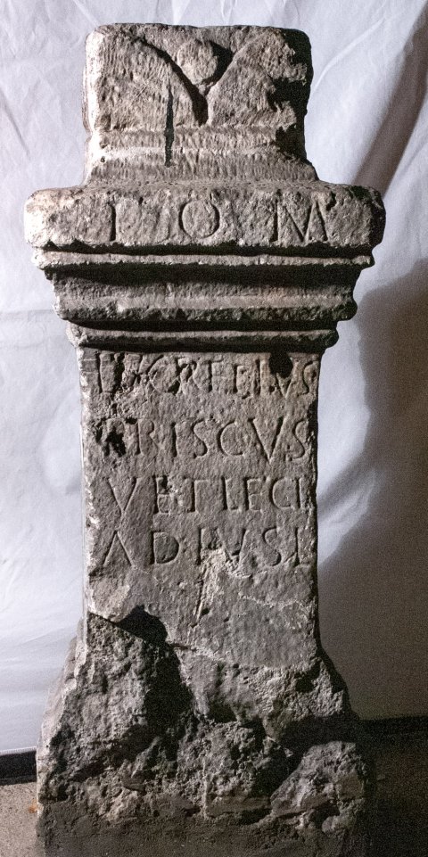 - I(ovi) O(ptimo) M(aximo) // Lucretius / Priscus / vet(eranus) leg(ionis) II / Adi(utricis) v(otum) s(olvit) l(ibens) m(erito)