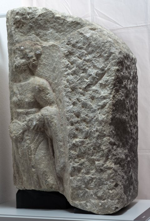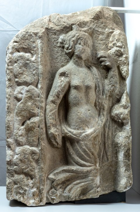 Auf der Außenseite Mythos : Selene (Luna), Mantel um Unterkörper und linke Schulter, Mondsichel auf dem Kopf, in der Rechten Stab oder Peitsche (?), rechts Baum, links Rahmenfeld mit Blattornament. Rechts schloss das Relief Nr. 522 mit dem schlafenden Endymion an ?