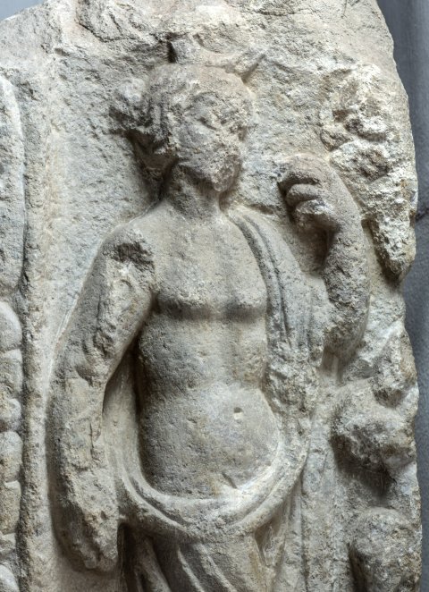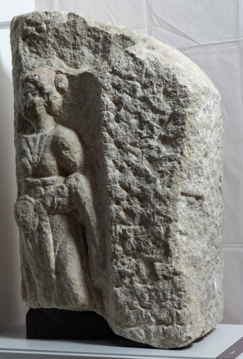 Auf der Innenseite Dienerin: Frau mit Haarknoten, gegürtetem Gewand, Tuch über dem linken Arm, in der Linken Schöpfgefäß. Rechts anschließend Relief mit Fleischhauer (Nr. 522, Innenseite) ? - Kommentar