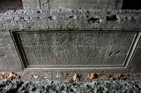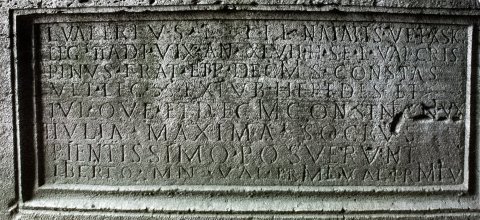 - D(is) M(anibus) // L(ucius) Valerius L(ucii) fil(ius) Natalis ve(teranus) ex sig(nifero) / leg(ionis) II adi(utricis) vix(it) an(nos) XLVII h(ic) s(itus) e(st) L(ucius) Val(erius) Cris/pinus fra(ter) et P(ublius) Decimius Consta(n)s / vet(eranus) leg(ionis) s(upra)s(criptae) ex tub(icine) heredes et / Iul(ia) quae et Decimia Constantis(?) coniu(n)x / et Iulia Maxima socrus / pientissimo posuerunt / libertiq(ue) man(umissi) Val(eria) Prim(a) et Val(erius) Primitiu(s)
